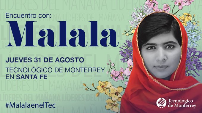 | ¡Malala viene a México! Se presentará en el Tec de Monterrey La activista dará una conferencia en el campus Santa Fe; su visita está programada para el 31 de agosto |